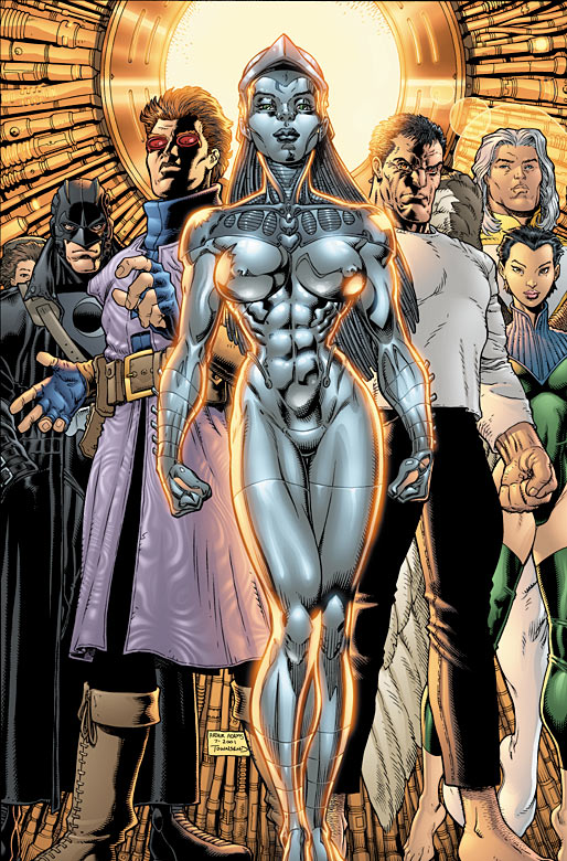 The Authority is a piece about a large superhero team that I believe is referred to as "Skywatch", it is hinted that another team called "Stormwatch" previously existed but the majority of the team died or disbanded a while ago. I had a hard time not relating the characters to those of the Justice League. There is a hawk girl on both, a dark brooding character looking a lot like Batman, and the character Apollo reminds me a lot of Superman. It's hard to have a large ensemble with characters that differentiate from other works with a large ensemble.